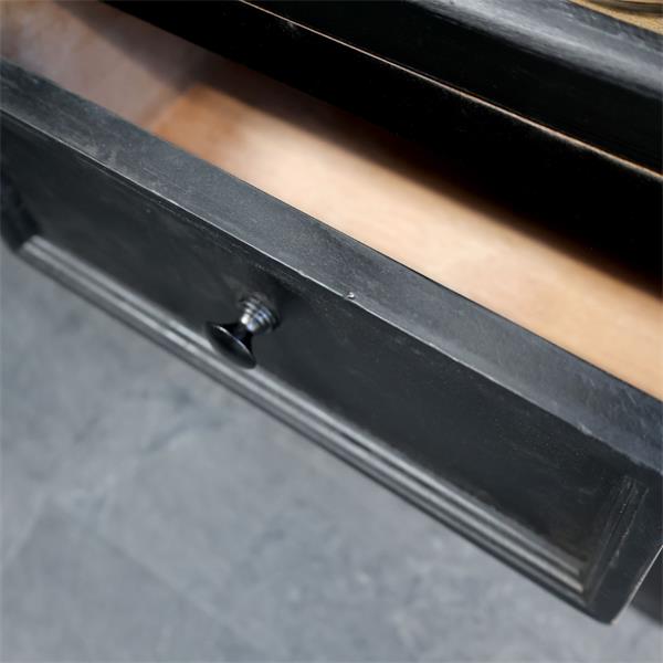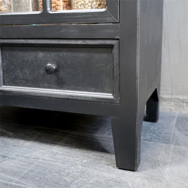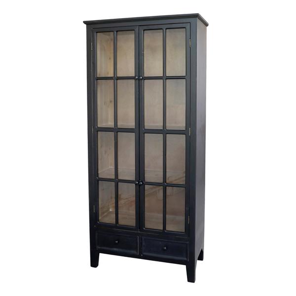 The cabinet features a stunning antique black finish that beautifully juxtaposes the natural wood interior. Behind the two glass doors, you’ll discover four spacious shelves designed to showcase your cherished items, from collectibles to decorative pieces. Below, the two roomy drawers provide additional storage, helping you maintain an organized and stylish environment.