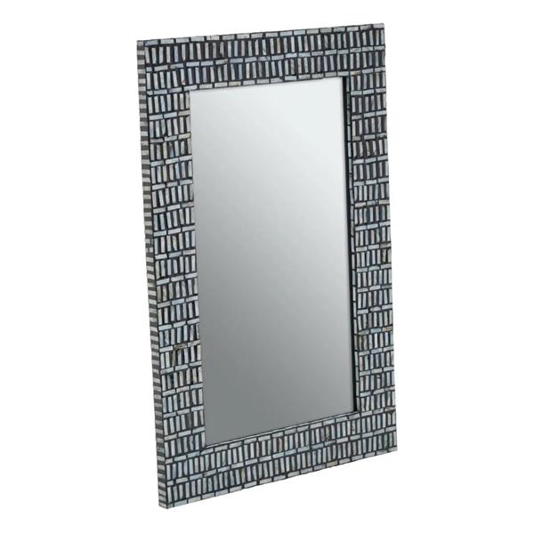 A mosaic of handcrafted seashells covers the frame of the Bria wall mirror, each one carefully placed by hand. Their silvery finish combines with the black frame to create a striking monochromatic effect. This mirror is a great addition to a boho-themed interior, serving as both a functional and aesthetic piece.