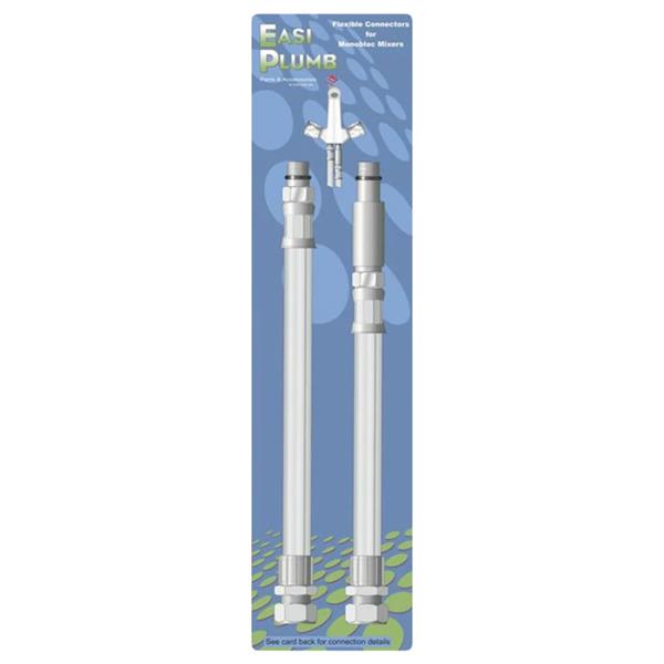 These Easi Plumb flexible connectors are designed specifically for plumbing monobloc mixer taps. The pack includes two tap connectors, each 400mm long, featuring compression ends for a secure connection. The connector dimensions are 1/2" by 10mm.
