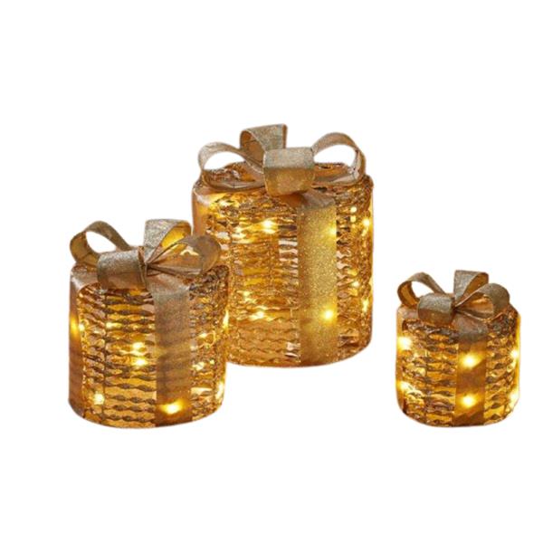 Complete with elegant ribbon detail, these decorative boxes are not only beautiful but also practical. With 45 warm white LEDs per set, they illuminate your space with a warm, inviting glow. Plus, the convenient auto timer feature ensures they automatically light up for 6 hours and turn off for 18 hours—perfect for hassle-free holiday decorating!