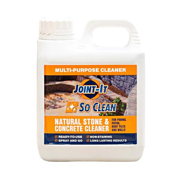 The Joint-It So Clean is a high-performance, fast-acting multi-purpose cleaner specifically formulated for natural stone, concrete, and tarmac surfaces. It penetrates deep into the material to lift dirt and stains without altering the appearance of the surface, making it ideal for patios, driveways, and paths. The cleaner comes complete with a "spray-and-go" formula that requires no scrubbing for general maintenance.