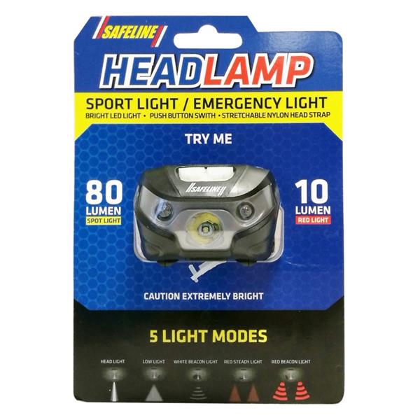 This Safeline Headlamp is an all-powerful, hands-free lighting solution. It is rechargeable via USB and features 5 Light Modes: Headlight (80-lumen spotlight), Low Light, White Beacon Light, Red Steady Light, and Red Beacon Light.