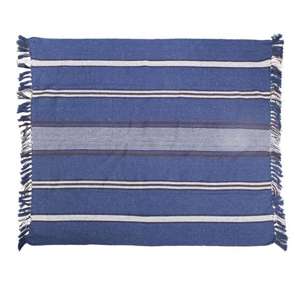 Plaid in soft cotton with a woven striped pattern in white, blue, and brown, with fringes. Perfect for the balcony, patio, or a picnic.
