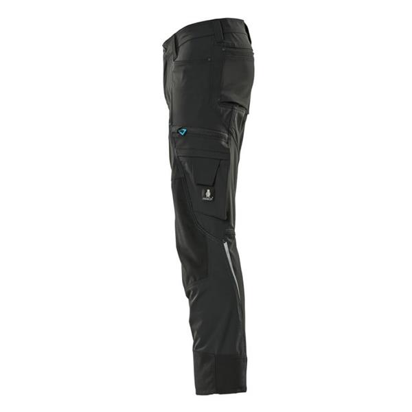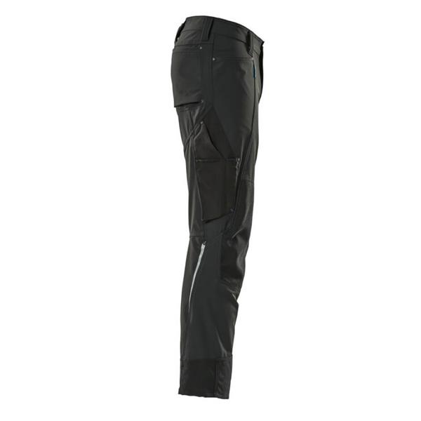Has a water-repellent finish. Four-way stretch fabric that is lightweight and highly durable. The fabric is hardly felt against the skin as the pockets are integrated in the design. Double stitched seams on leg and crotch. Low waist. Ergonomically formed trouser leg. Belt loops. Fly with zip. Front pockets. Back pockets. Thigh pocket with phone pocket. Ruler pocket of CORDURA® with extra pockets. Kneepad pockets in durable CORDURA® (500 D). Reflectors. We recommend MASCOT® Waterloo kneepads for this model.