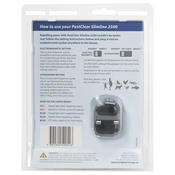 The PestClear Slimline 2500 is an advanced pest repeller designed to protect your entire home, covering up to 232 sq. metres (2,500 sq. feet). It utilizes a combination of electromagnetic signals sent through house wiring and ultrasonic high-frequency sounds to repel mice, rats, and crawling insects. This unit features a dedicated Pet-Safe setting to ensure it does not disturb rodent pets like hamsters or rabbits when they are in the same room.
