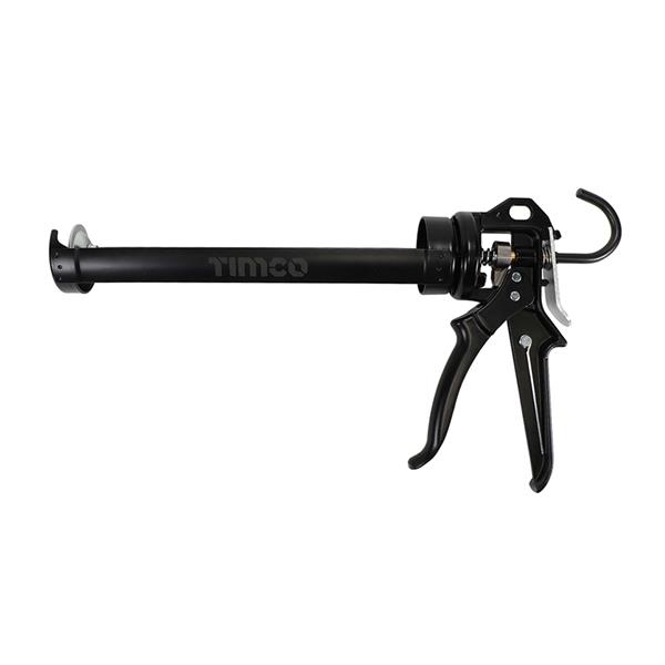 The TIMCO Professional Sealant Gun  is a heavy-duty sealant and caulking gun, measuring 10 1/2 inches in length. It features a swivel action barrel for easy application into tight corners and a convenient hook end for hanging. The gun incorporates a patented non-drip mechanism, ensuring clean and efficient work, and boasts a 12:1 trigger ratio for optimal control. Weighing approximately 820g, it is designed to fit standard 310ml sealant cartridges, making it an essential tool for professional applications.