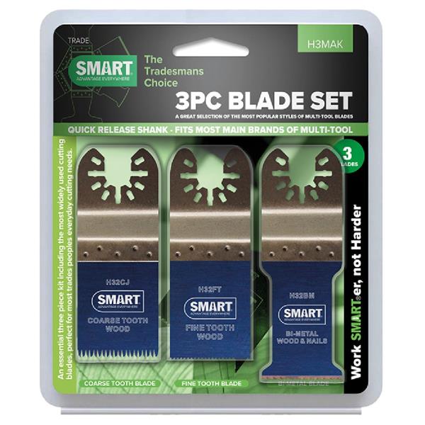 This SMART Trade Series 3 Piece Blade Set is a great value kit designed for a wide range of applications. It includes three blade types: a 32mm Fine Tooth, a Japanese Tooth, and a Bi-Metal blade. These blades are suitable for cutting various materials, including wood, hardwood, plastic, drywall, non-ferrous metal, and nails. The set features a universal open-back design, which is not compatible with Starlock systems.