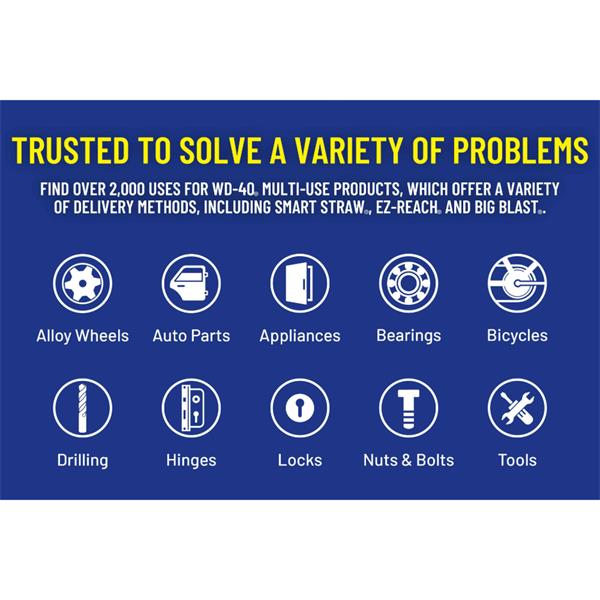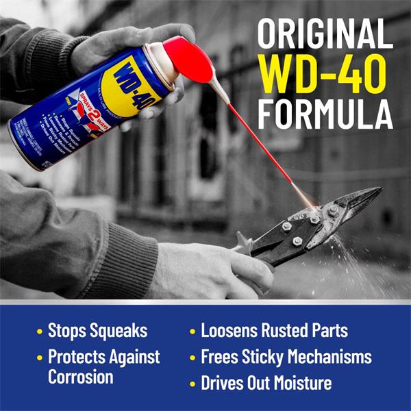 WD-40 Multi-Use Product protects metal from rust and corrosion, penetrates stuck parts, displaces moisture and lubricates almost anything. Its permanently attached Smart Straw sprays 2 ways®.